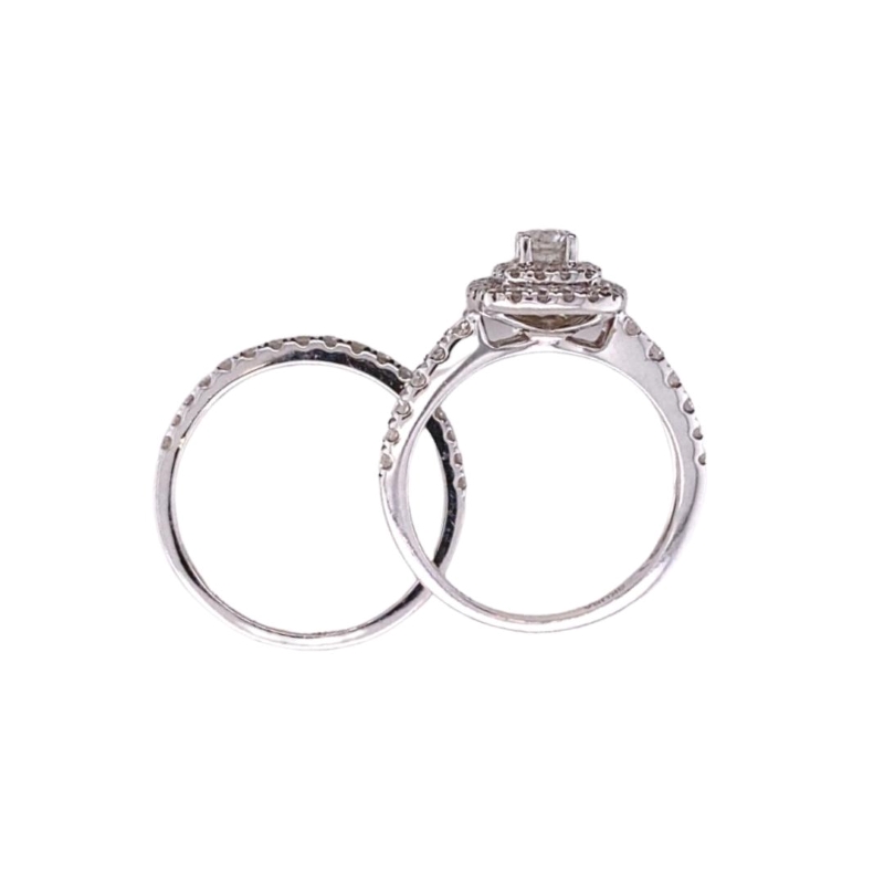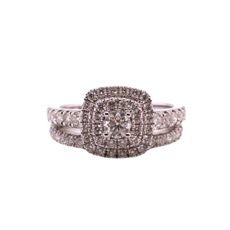 One polished 14kt engagement setting featuring a cushion-shaped double halo with diamonds extending halfway down the band with a round centerstone. This comes with a matching wedding band with diamonds halfway around. Size – 6.75. Sizing available upon request.