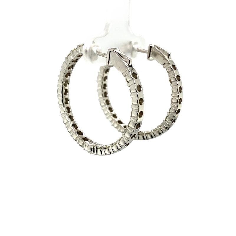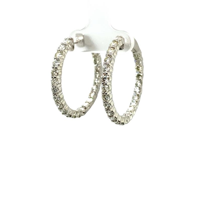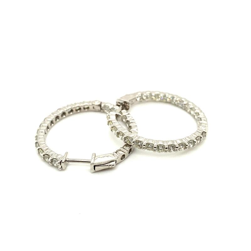 14kt white gold 3mm diamond inside and outside hoops with 23 rounds diamonds on each hoop, 3.72ctw, SI-1 Clarity and H Color. Diameter is approximately 30mm.
