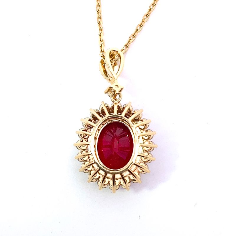 62 Round Lab Grown Diamonds at 1.57ctw, VS Clarity and G Color. One 12.5x10mm 5.63ct Lab Grown AAA Ruby in Center. Crafted in 14kt Yellow Gold and on 18″ Cable Chain.