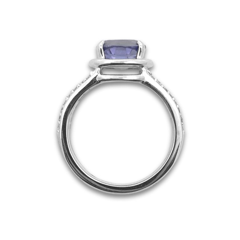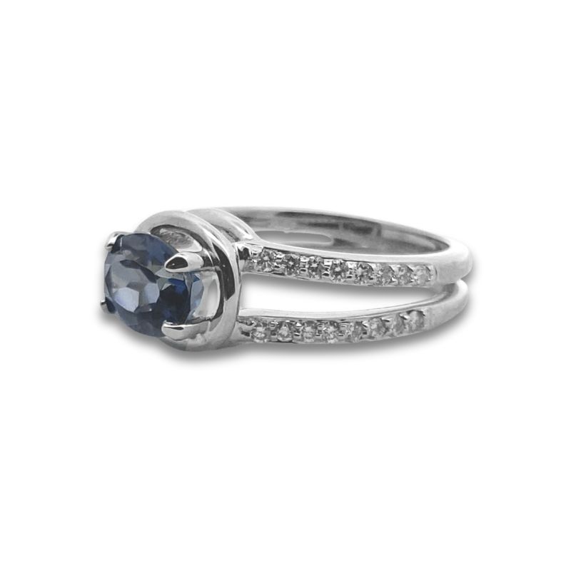 6 x 8mm Purple/Blue Iolite Gemstone set in a White Double Basket with Diamond Split Shank Halfway Around, Diamonds Weight 0.32ct, Crafted in 14kt White Gold.