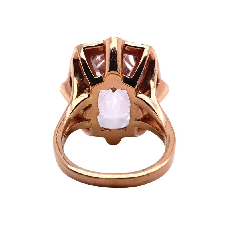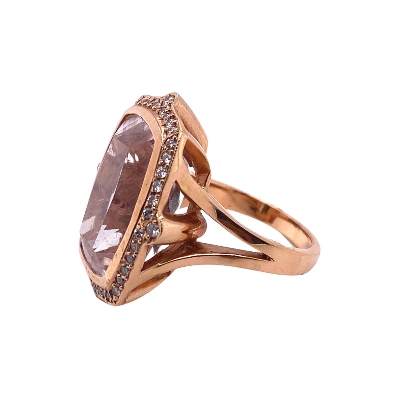 One polished 14kt rose gold split shank cocktail ring setting featuring a 18.50ct elongated cushion-cut kunzite bezel set within a 0.53ct pave set diamond frame. Size – 6.75