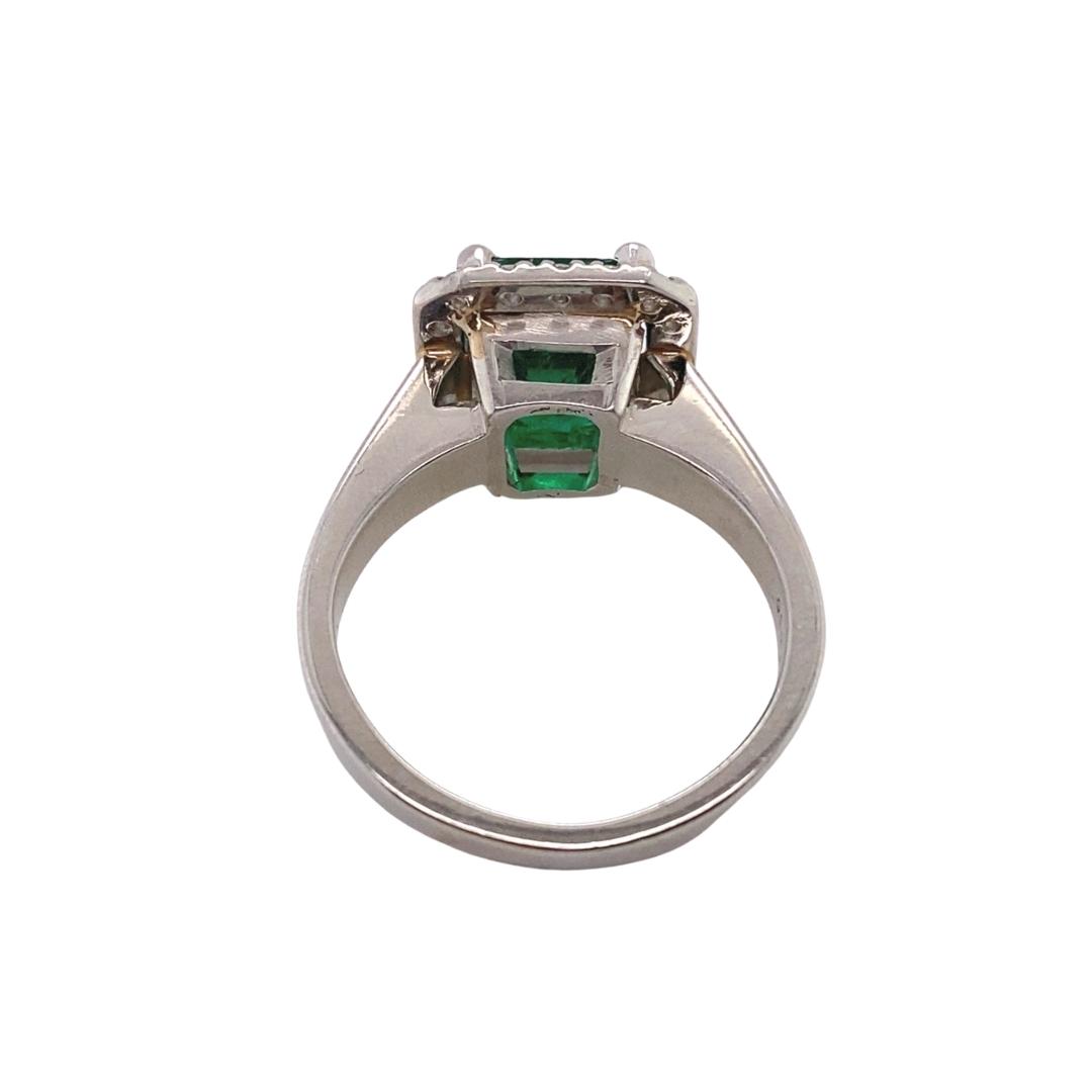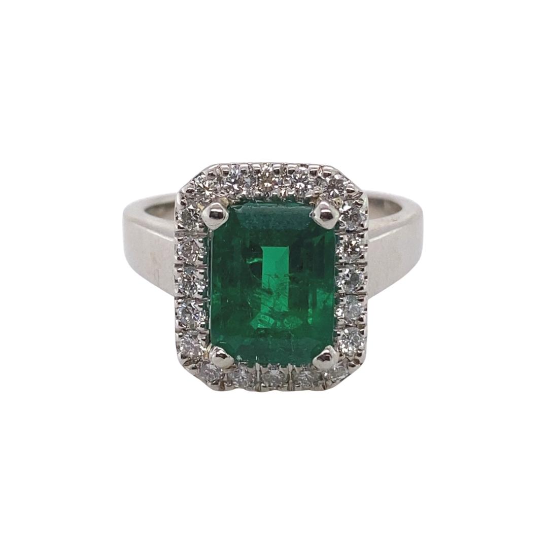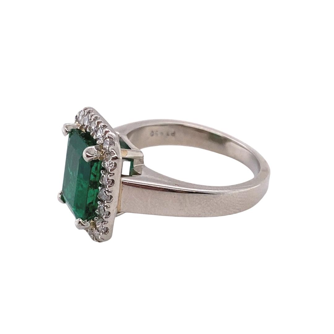 Platinum, Emerald and Diamond Ring. 1 Emerald Cut Emerald Lab Grown 2.80c10x8mm, AAA. 20 Round Diamonds – 0.60cts, VS-G. This ring is sizable