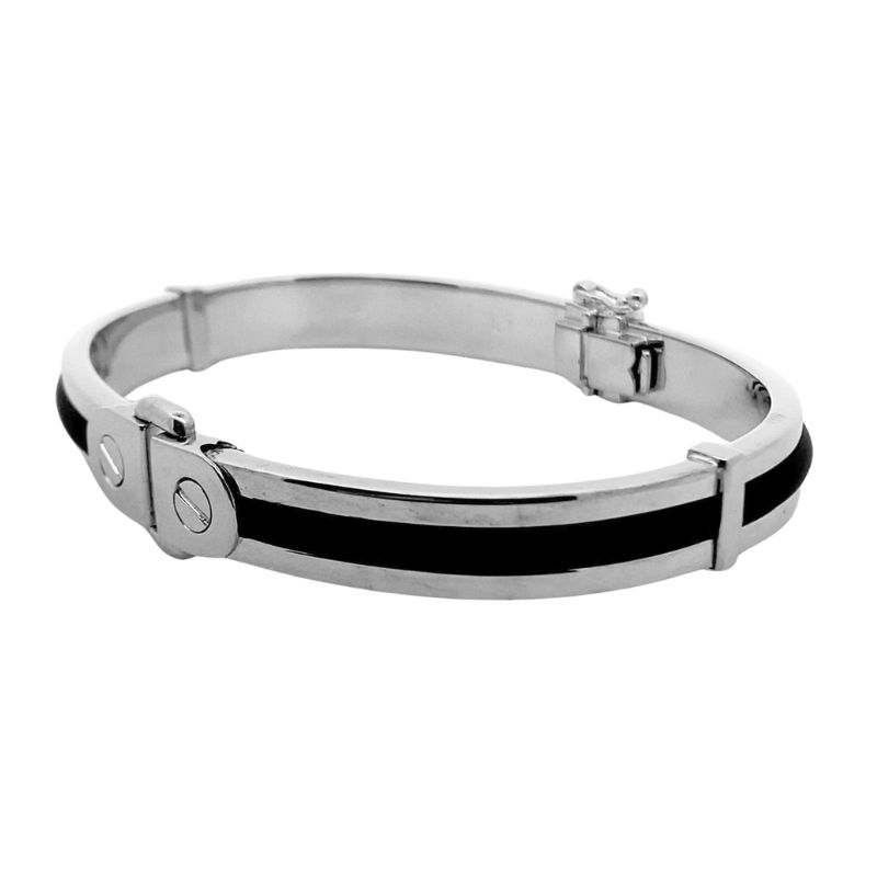 Gents 9mm Polished White Gold Hinged Bangle Bracelet with 3.2mm Black Rubber Inlay