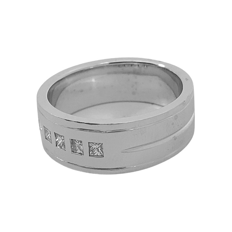 8mm wide men’s wedding band featuring 5 gypsy set princess-cut diamonds, 0.28ctw. Crafted in satin finsihed 14kt white gold sith a flat profile and grooved accents.