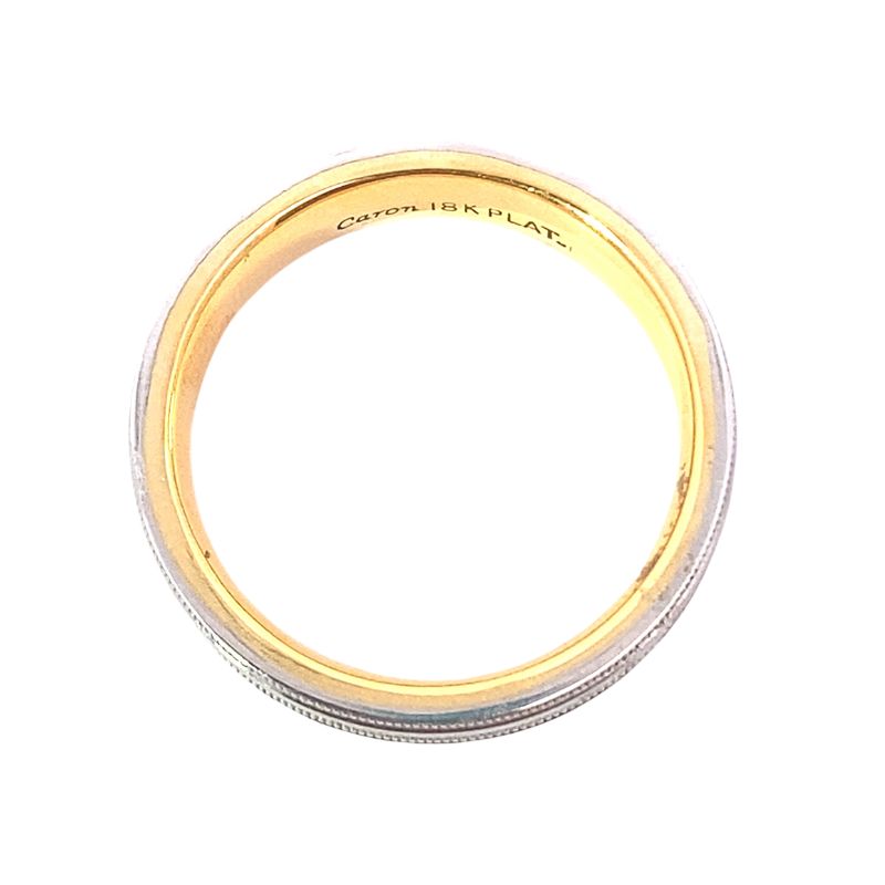 6mm wide gents wedding band with three rows boarded in milgrain crafted in platinum with a 18kt yellow gold sleeve. Finger Size – 10.