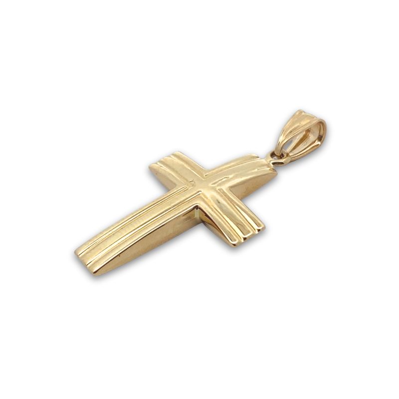 One grooved concave cross pendant crafted in 14kt yellow gold with a polished finish. Dimensions – 28x18mm. made in Italy