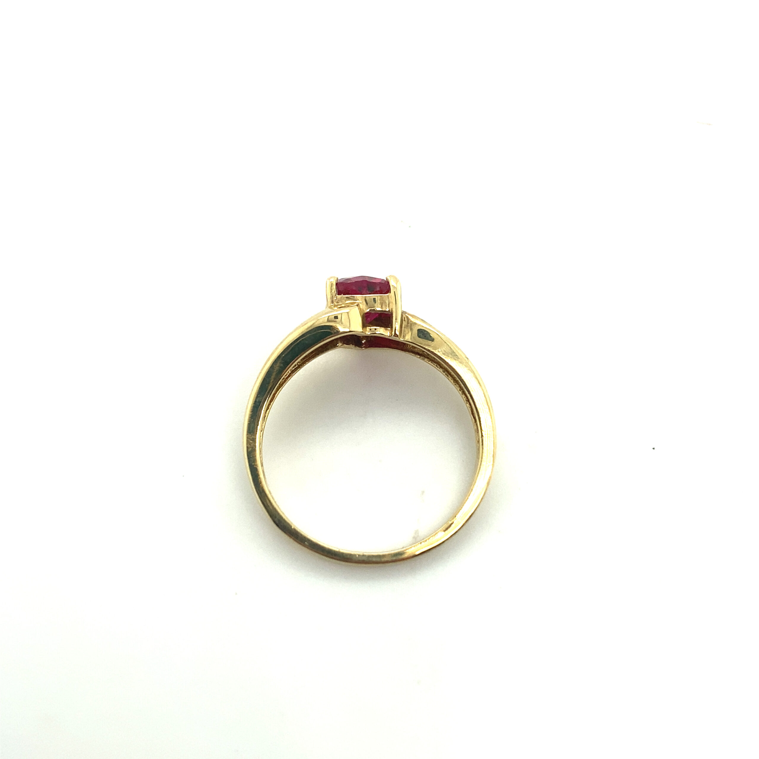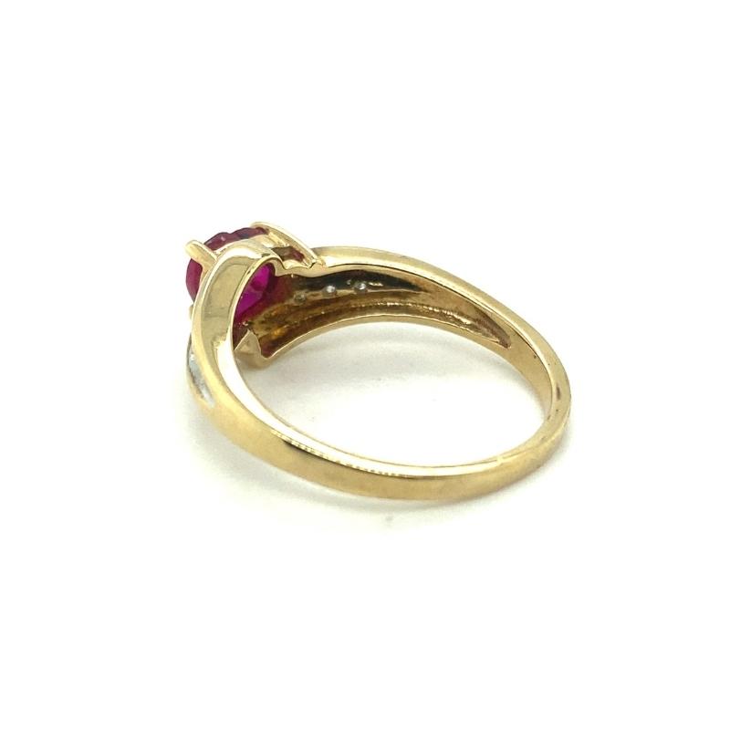 Lab-Created Heart Shaped Ruby with Diamond accents, 0.05ctw I-1 H. 10kt yellow gold.