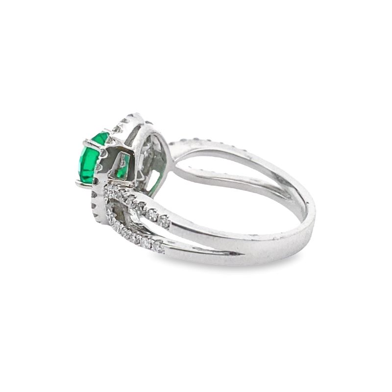 LAB CREATED EMERALD 6.0MM WITH 69-RD 1.05CTW, SI-1-2, G. 12.5mm WIDE and CRAFTED IN 14KT WHITE GOLD SIZED AT A LADIES 7.