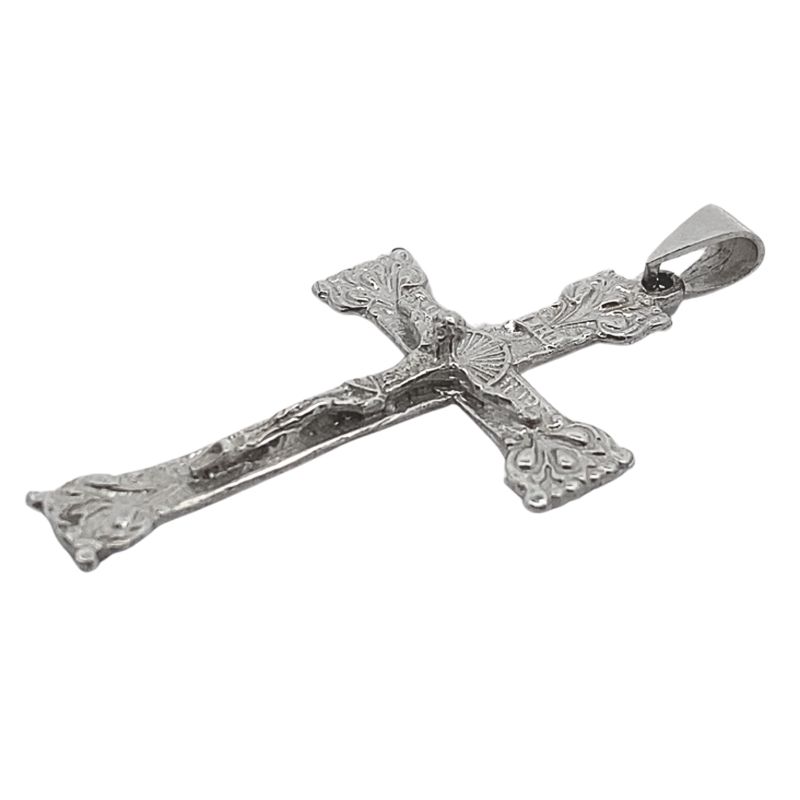 Large Floral Crusifix Crafted in 14kt White Gold. 46mm x 27mm. Crafted in 14kt White Gold