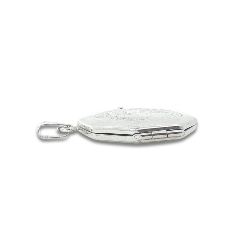 22mm Wide Octagon Shapped Locket. With Carvings in the Front and Polishd back for Engravings. Open up to 2 Pictures. Crafted in 14kt White Gold