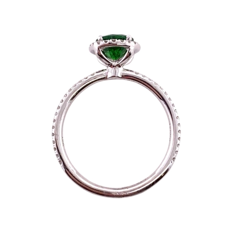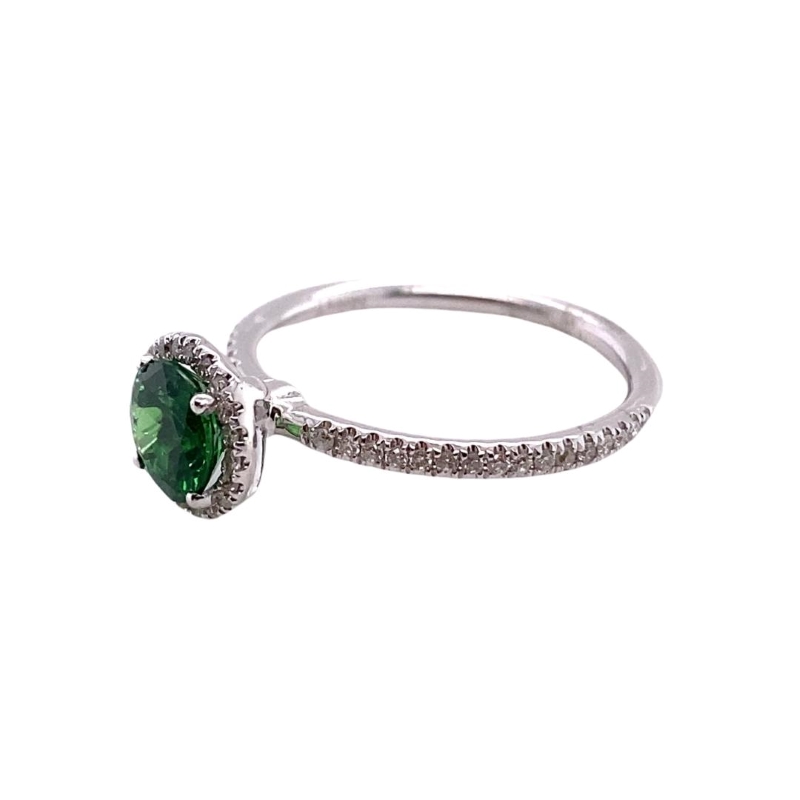 One Miera T Designer ring setting made up of 14kt polished white gold with a 0.70ct green savorite center prong set within a diamond halo that extends halfway down the band weighing a total of 0.18cts of round prong set diamonds. Size – 4.5. Sizing available.