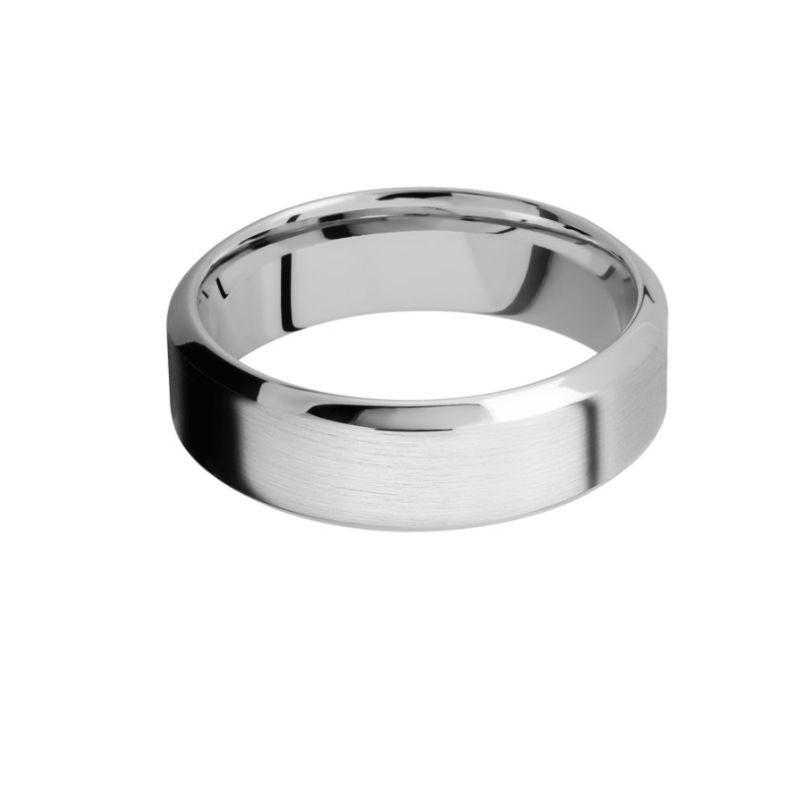 Mens Beveled Wedding Band, 7mm. 14kt White gold brushed center with high polished beveled edges. Available in Platinum, and all 3 Gold Colors.