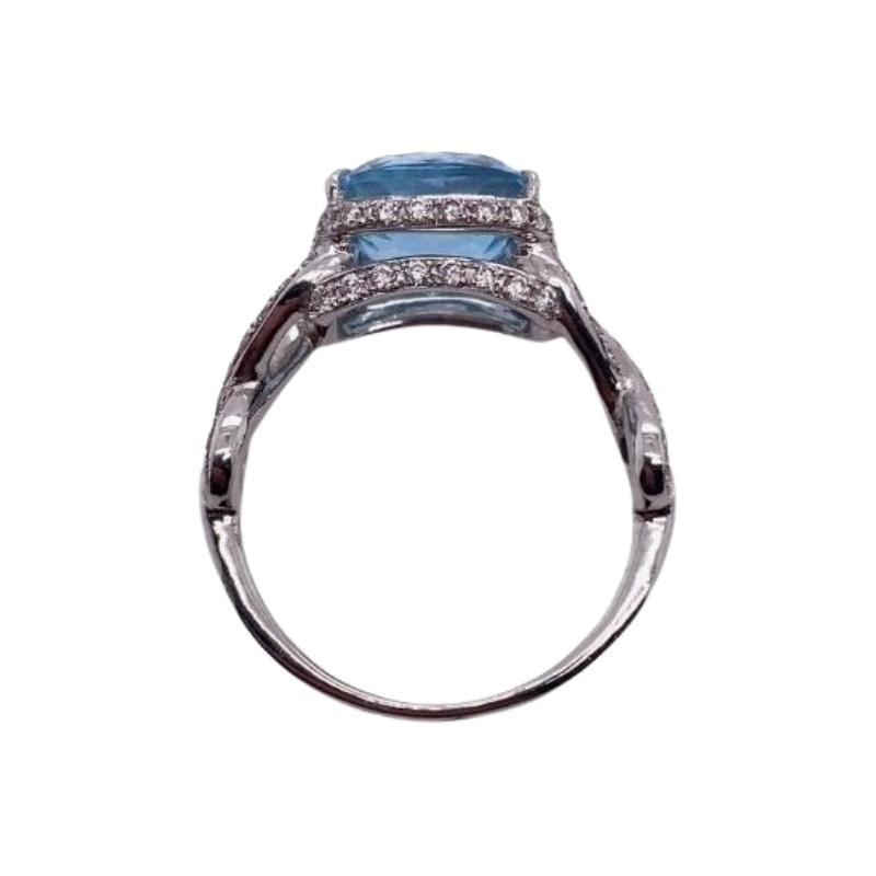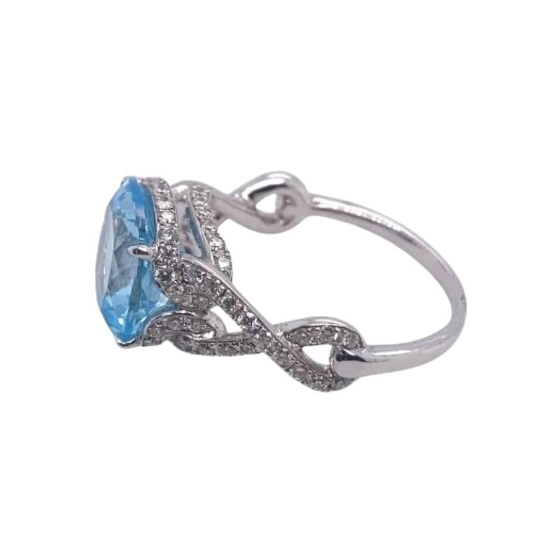 One 18kt white gold twisted shank setting featuring a 2.99ct blue topaz as the center stone with 0.65cts of micro-pave set diamonds extending halfway down the shank. Size – 6.75.