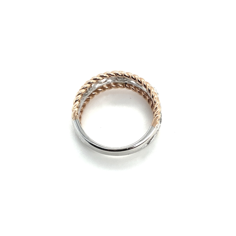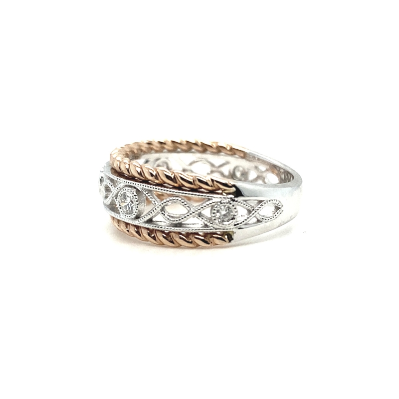 Milgrain Bezel Set Diamond Right Hand Ring with 5 Round Milgrain Bezel Set Diamonds at 0.14ctw, SI-1 in clarity, and G in color. Crafted in 14kt White and Rose Gold, Currently a size 6.5.