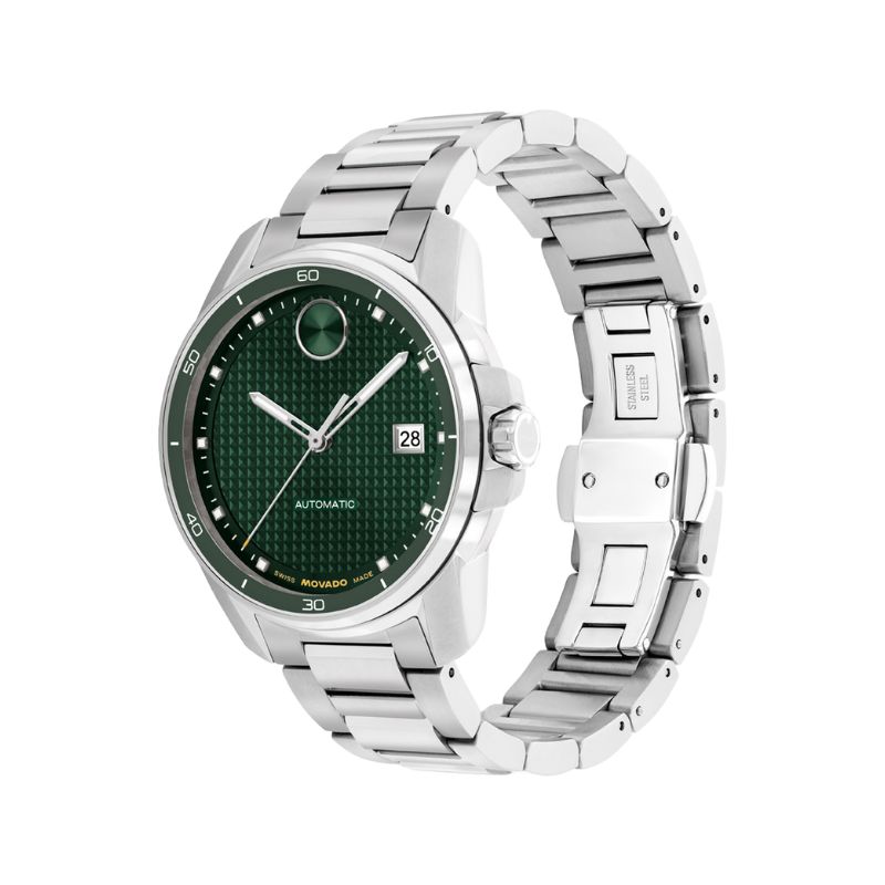 Movado BOLD Verso Automatic 41mm Green Dial #3600962, Swiss Automatic Movement with up to 80 Hours Power Reserve, Sapphire Crystal, Stainless Steel Case and Bracelet with Butterfly Clasp, Water Resistance up to 10 ATM, Comes with Full 3 Year Warranty.