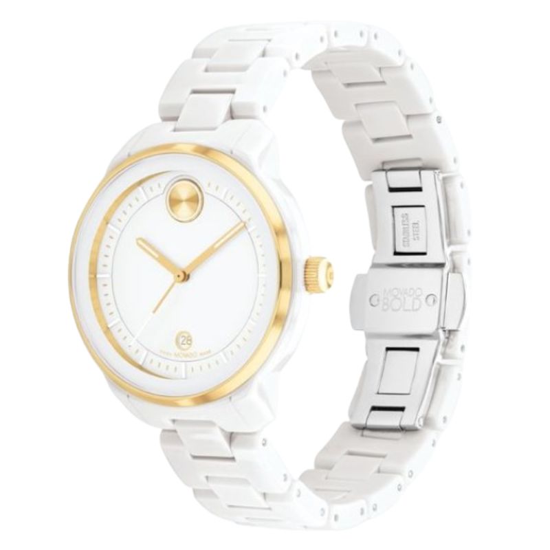 Movado Bold Verso, White Ceramic 3601074. White Dial w/ Gold Accents. White Ceramic Case and Bracelet. Quartz Movement. 39mm.