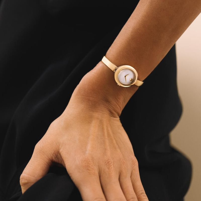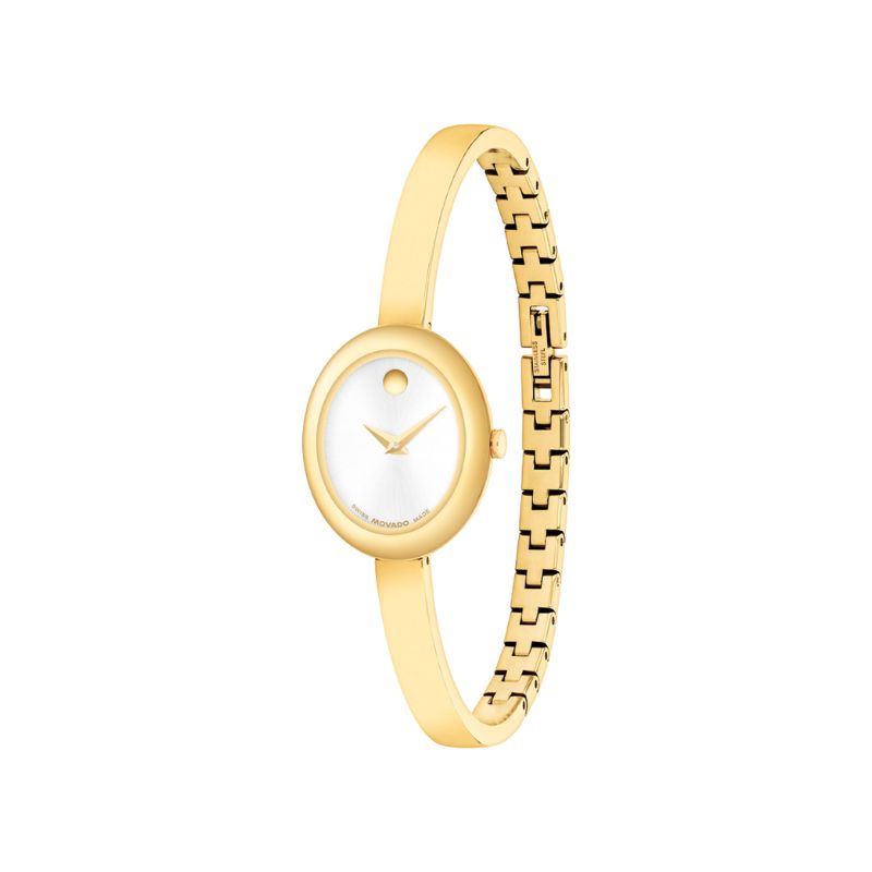 Movado Museum Bangle, Oval Case, Silver/White Dial, Case Size 21.5 X 25.5, light yellow gold PVD-finished stainless steel case, bangle bracelet light yellow gold PVD-finished stainless steel, Sapphire crystal, Water Resistance up to 30 meters, #0608072