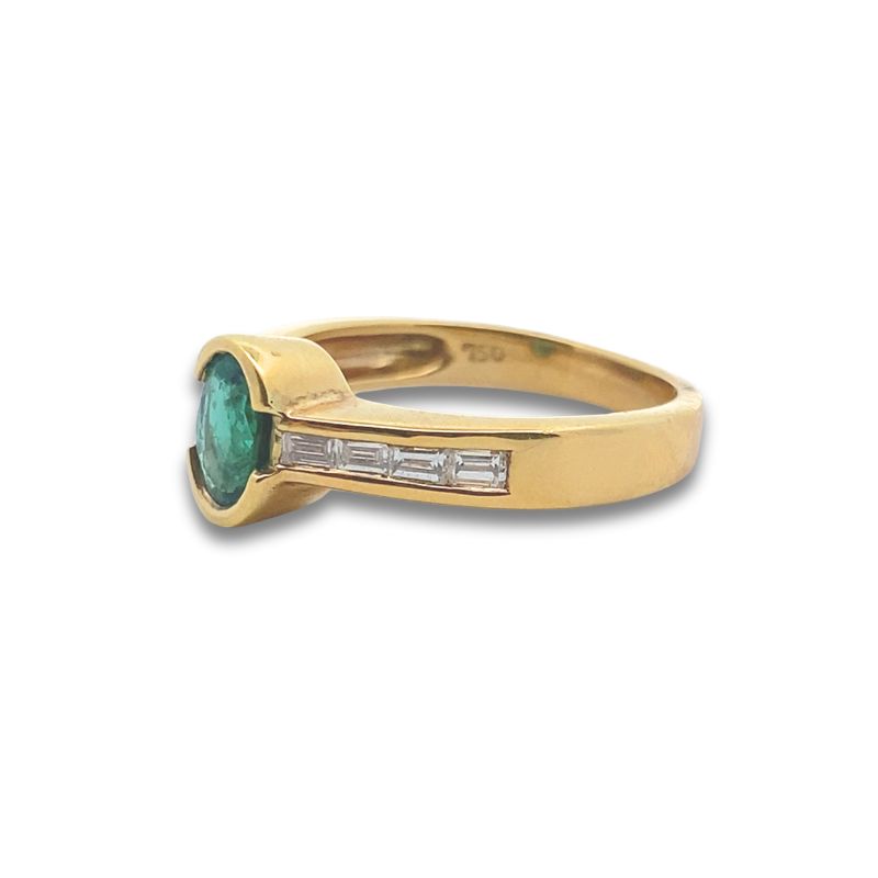 Natural 0.69ct Green Oval Shaped Emerald with Side Emerald Diamonds, 18kt Yellow Gold