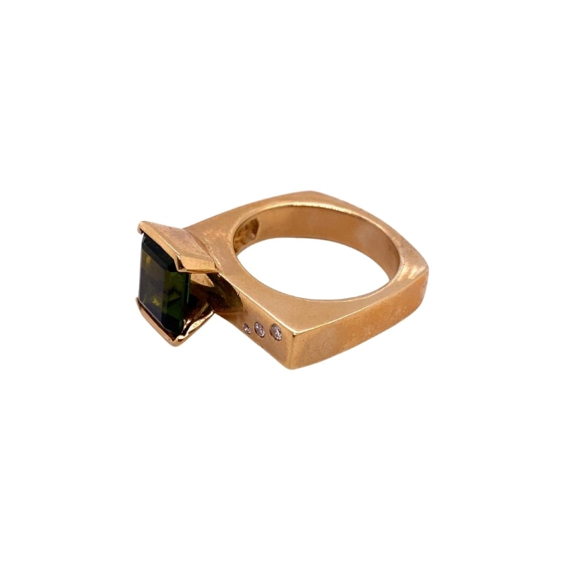 One 14kt polished yellow gold ring setting with one channel set, emerald-cut green tourmaline. The dimensions of this stone are 10.0mm X 8.0mm. There are 3 invisibly set SI1/F-G diamonds weighing a total of 0.03cts set in a diagonal line on the setting. Size – 8.75. Sizing available upon request. Additional charges may apply. Please inquire within.