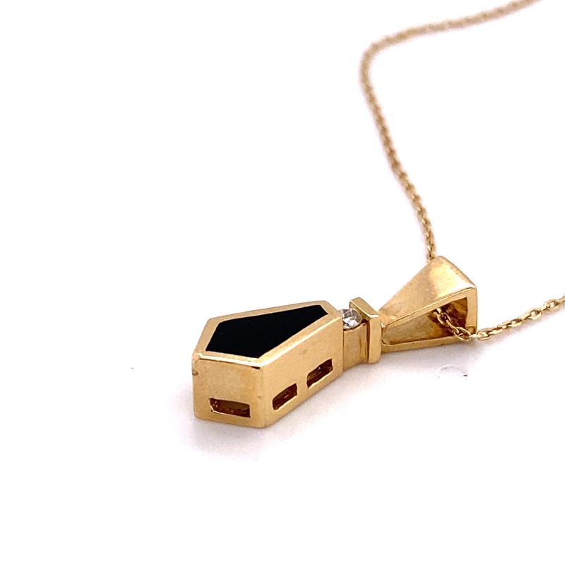 Onyx and Diamond Drop Pendant, 14kt Yellow Gold. 1 Round Diamond Channel Set, Carat- 0.05 Clarity-SI Color-F/G and 1 Smooth Black Onyx Stone Drop. Chain is sold separately.