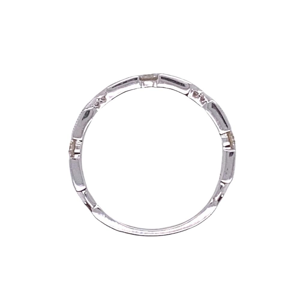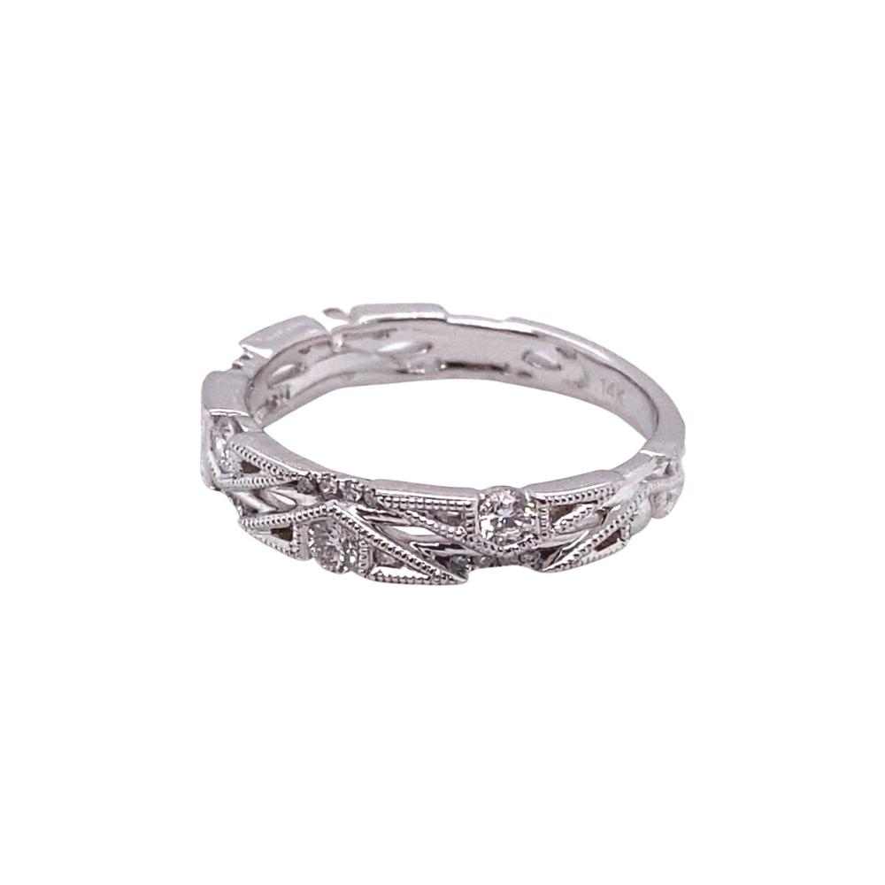 Openwork Round Diamond Band, 14kt White Gold. Round Diamonds with Milgrain Detailing, Carat-0.32 Clarity-SI-1 Color-F-G Diamonds are 3/4 way around the band. This Ring is Sizeable and Available in Platinum and all 3 Gold Colors.