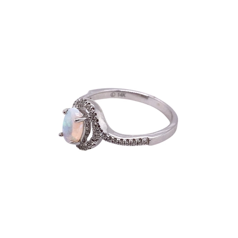 One 14kt polished white gold halo setting with one 0.50ct white, iridescent oval opal prong set within a halo. The halo extends halfway down the band with a total of 38 round SI1/F-G diamonds weighing a total of 0.23cts.