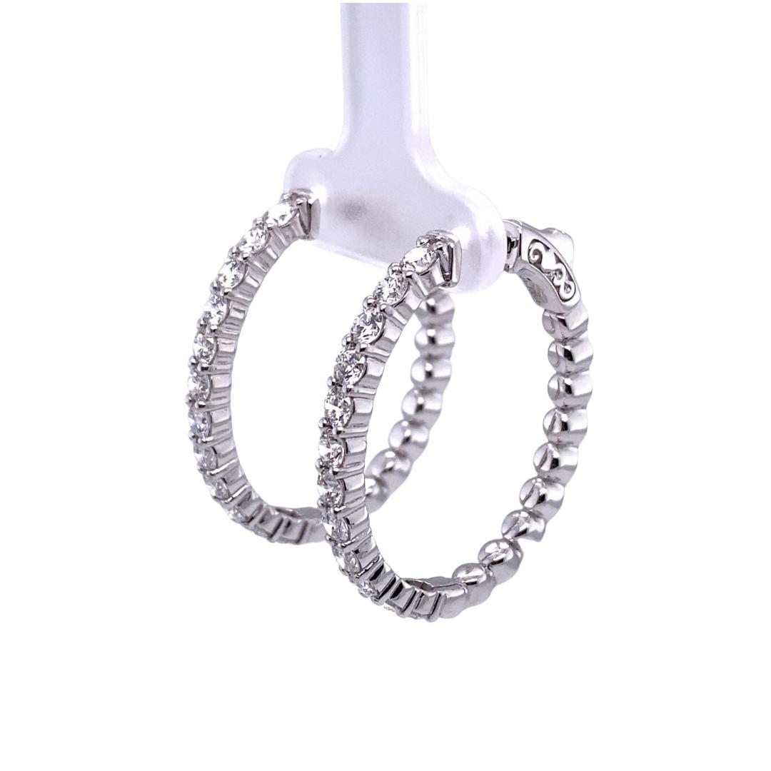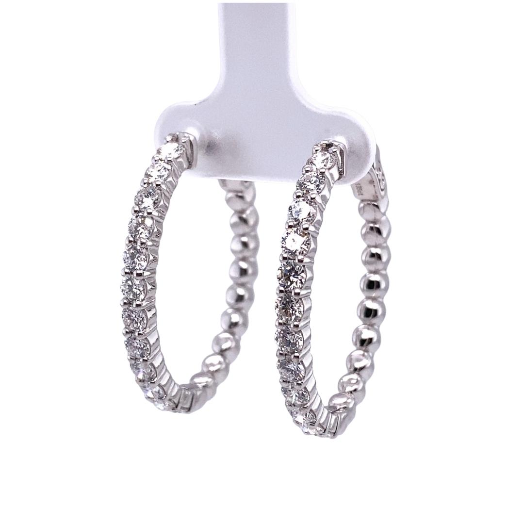 Oval Shared Prong Hinged Diamond Hoops, 14kt White Gold. 24 Round Diamonds – 2.27cts, shared prong set. VS2-SI1/FG Dimensions – 32 x 27mm