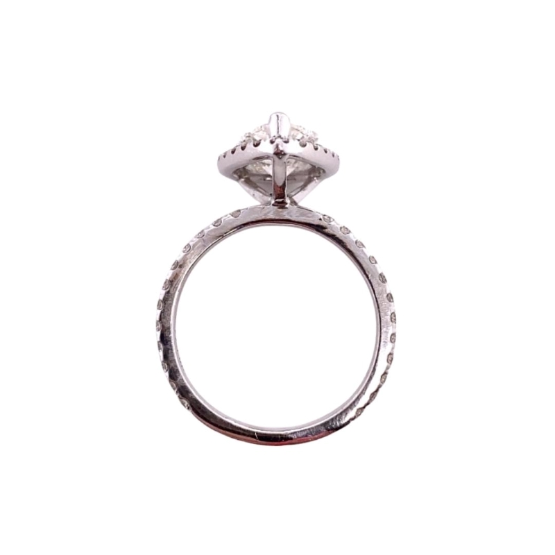 One polished 14kt white gold ring setting featuring a diamond pear-shaped halo with diamonds extending 3/4 around the band. There are a total of 45 round diamonds weighing 0.60cts. The center stone is a 1.73ct SI1/H EGL certified pear-shaped diamond prong set within the halo. Size – 5. Sizing available upon request.~0D~0A~0D~0ASetting Retail Price – $2,300~0D~0ACenter Stone Retail Price – $16,349~0D~0ATotal Package Retail Price – $18,649~0D~0A~0D~0ASale Price – 30% OFF – $$13,055~0D~0A~0D~0A~0D~0A~0D~0APEAR-SHAPE HALO-RING, 45-RD 0.60C