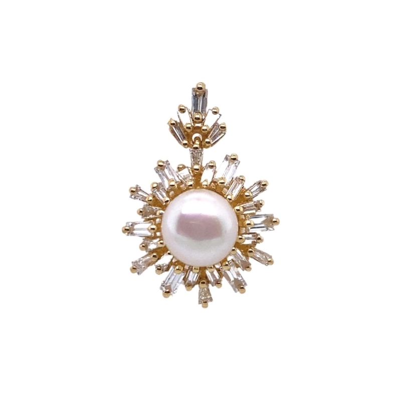 Pearl Baguette Sunburst Halo Necklace, 18kt Yellow Gold. 1 Pearl Center Stone, Carat-1.55ctw surrounded by 29 Baguette Diamond and 2 Round Bezel Set Diamonds in the Chain, Carat-0.66ctw Clarity-SI2 Color-F/G. Currently on a 16″ Thin 18kt Yellow Rollo Chain.