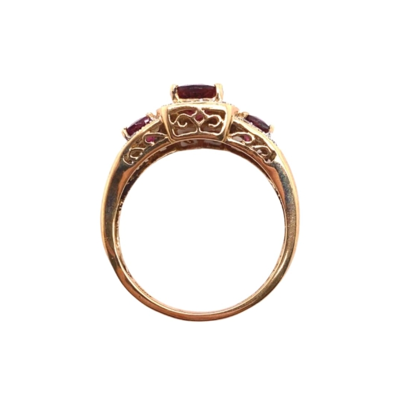 One 14kt polished, yellow gold ring setting featuring three, oval shaped, deep pink-toned, checkerboard topped pink tourmalines prong set within three single-cut diamond halos made up of 30 round SI1/F-g diamonds weighing a total of 0.25cts. Size – 8.3. Sizing available upon request. Additional costs may apply. Please inquire within.