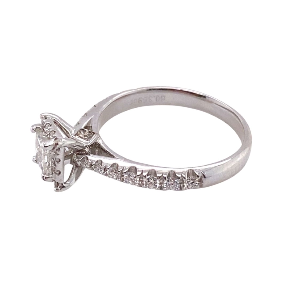 Princess Cut Halo Engagment Ring, Carat 0.35, Clarity SI-3, Color H, with 26 round diamonds 1/2 of band and surronding the center stone, Carat 0.30ct, Clarity SI-1 F set in 14kt White Gold.