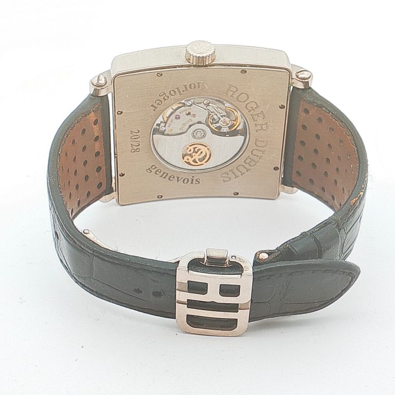 Roger Dubuis Golden Square Model #G43570G44.7A. Champagne Guilloché Dial. 43mm Square Case, 18kt White Gold with Exhibition Caseback. Mint Preowned with Box and Papers and full 3 Year Warranty