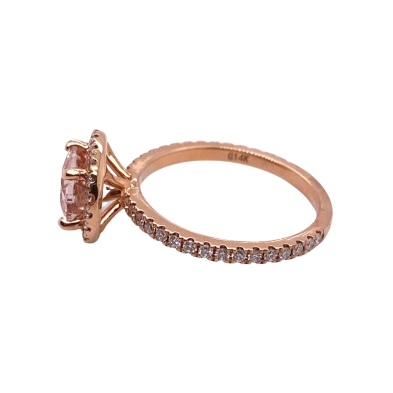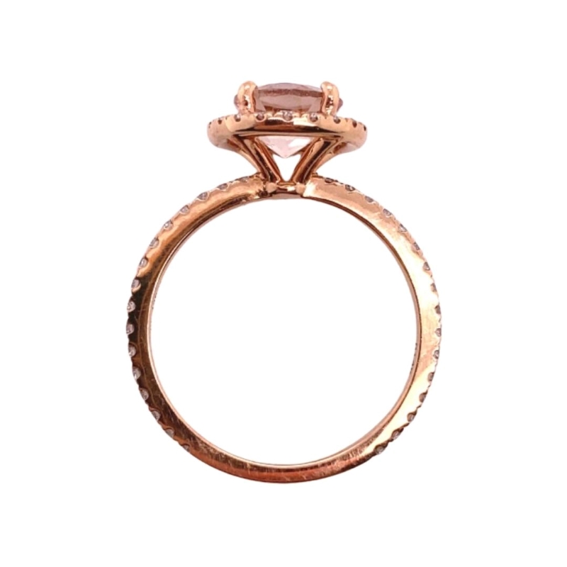 One 7mm, round peach-toned morganite, 1.23ct, set within a diamond halo and 3/4 diamond band with 52 round SI1/F diamonds in 14kt rosegold. Size – 6.5. Sizing available upon request.