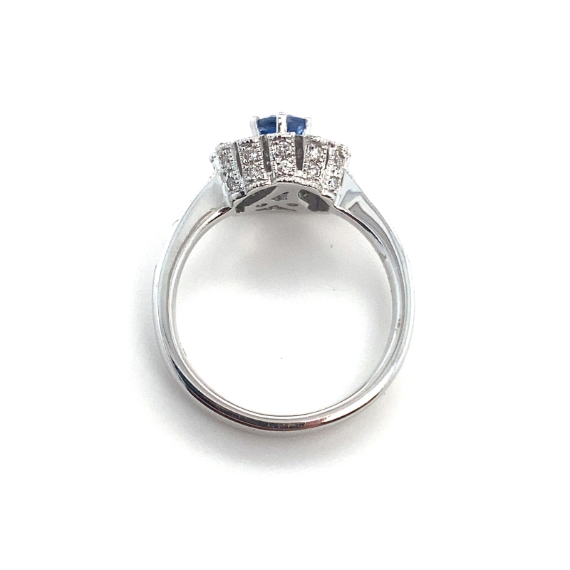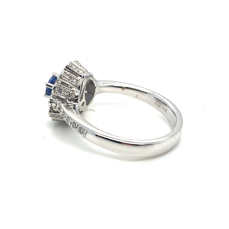 0.63c round sapphire center stone with an antique style 42-rd at 0.40ct pave set diamond milgrain flower halo and a high set crown setting, crafted in 14kt white gold.