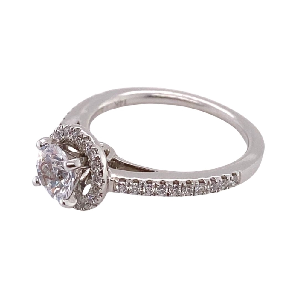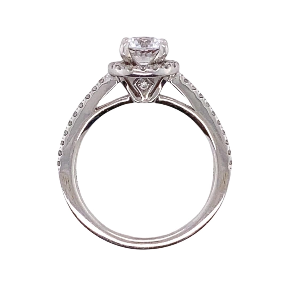 Scott Kay ‘Luminare Collection’ round halo engagement ring setting with a halfway prong set diamond band. Currently set with a round cubic zirconium. Diamond center stones available for purchase. Size- 6.5. Weight- 4.4 grams. Width- 1.35mm. Sizing available upon request.
