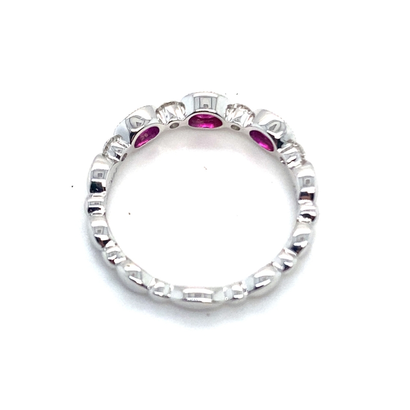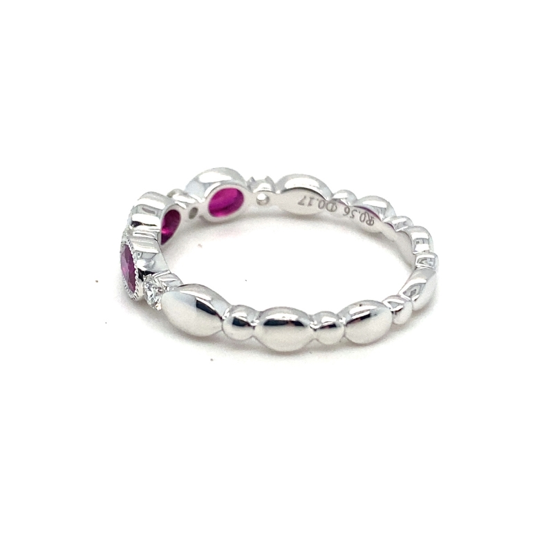 Stackable Oval Rubies and Diamond Band with 3 Oval Rubies, 0.56ctw, and Two Round Diamonds set in between, 0.17ctw, Clarity SI-1, Color F/G, crafted in 14kt white gold. Sizeable upon request