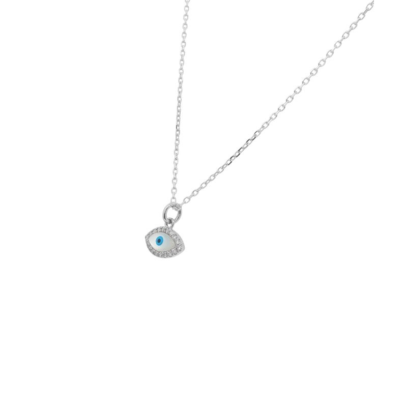 Small Evil Eye Pendant with 18 Round Diamonds Split Prong set at 0.07ctw, SI-1 Clarity and F Color. Opague Stone for Eye with Blue Center, 9.5mm Wide and Crafted in 14kt White. On 16~22 D/C Cable Chain with Lobster Clasp, Available in all 3 Colors of Gold