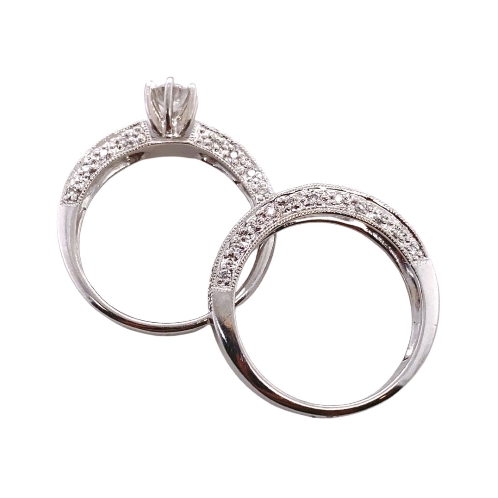 Wedding Set with Round Diamonds, Comes with Engagment Ring with Round Center Stone, Carat 0.33, Clarity SI-1, Color G, set in 14kt White Gold with Round Diamonds around 1/2 of the ring. Also, Matching Wedding Band with round diamonds half way around the band, Carat 0.35, Pave set in 14kt White Gold. Both have Milligrain Finish.