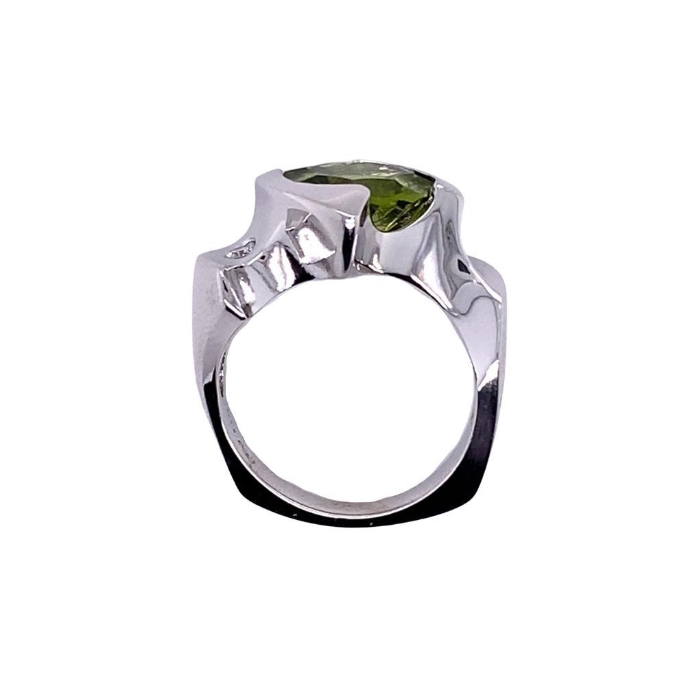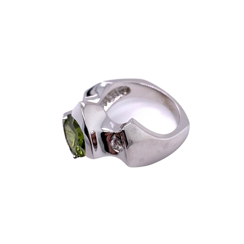 Starburst Cut Oval Peridot with accent diamonds, 14kt white gold. Peridot – 11 x 9mm. 2 Round Diamonds – 0.10cts. This ring is sizable