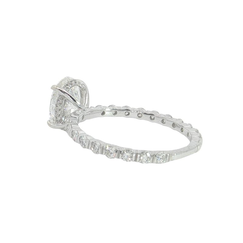 Timeless Bridal Split Line Engagement Ring with 42 Round Diamonds weighing 0.62ctw with VS Clarity and F Color. Set with Natural Oval Center Stone Weighing 1.50ct, VS-1 G, GIA Certification. Crafted in 14kt White Gold.