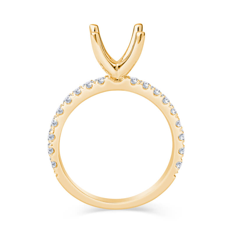 Timeless House Collection Round Diamond Solitaire Engagement Ring, 14kt Yellow Gold. As Pictured, will accommodate Round 1.50ct-2.25ct Center Stone with 18 round diamonds on the band, 0.52ctw SI1/F-G. Available in Platinum, White Gold, Yellow Gold and Rose Gold.