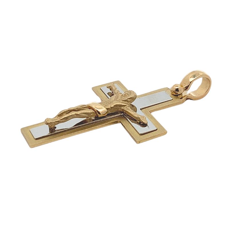 Two Toned Crucifix, 14kt Gold, 32mm long x 22mm, Polished Finish. Crafted in 14kt Yellow Gold Base with White Gold Accents