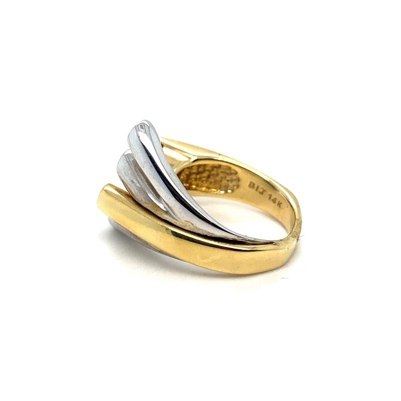 Two Toned Diamond and Amethyst Trillian Shaped Ring with 4 round diamond, .20ctw, bezel set in 14kt white and yellow gold.
