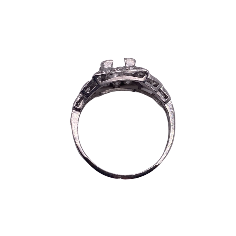 Vintage Art Deco Engagement Ring with Halo and Step going down the Side. 24 Round Diamonds at 0.75 Carat, VS Clarity and F-G in color. Currently for a 5-5.5mm Round Center. Circa 1920’s era and Crafted in Platinum and Sizable upon Request