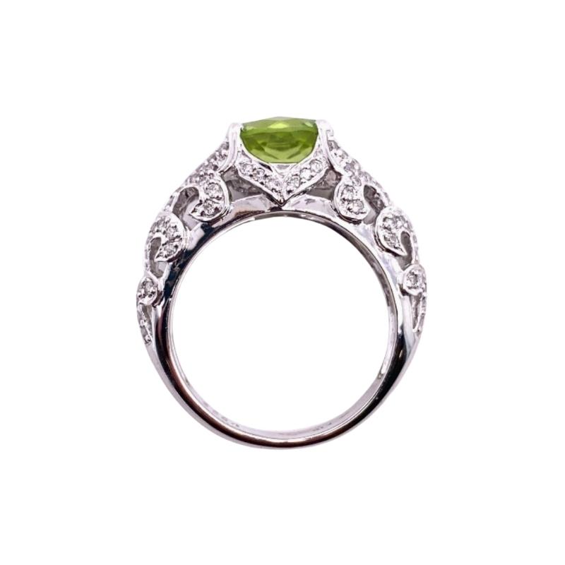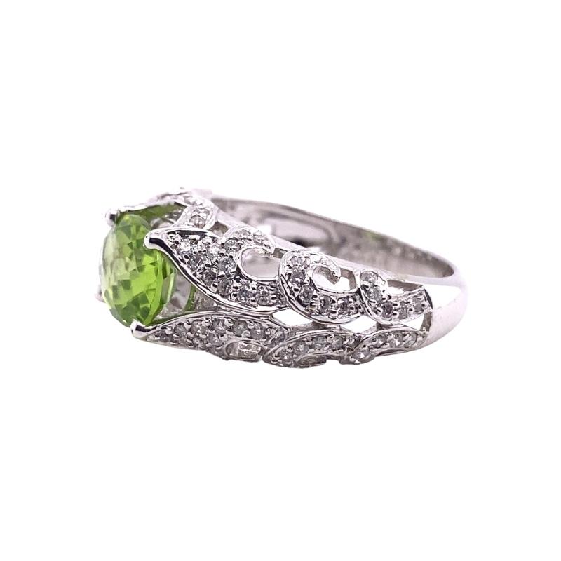 One 14kt white gold vintage-inspired ring setting that features a 9x7mm checkerboard-cut oval peridot prong set within a rounded band design that is encrusted with 0.50ctw diamond swirl patterns going halfway down the polished band. Size – 7.25
