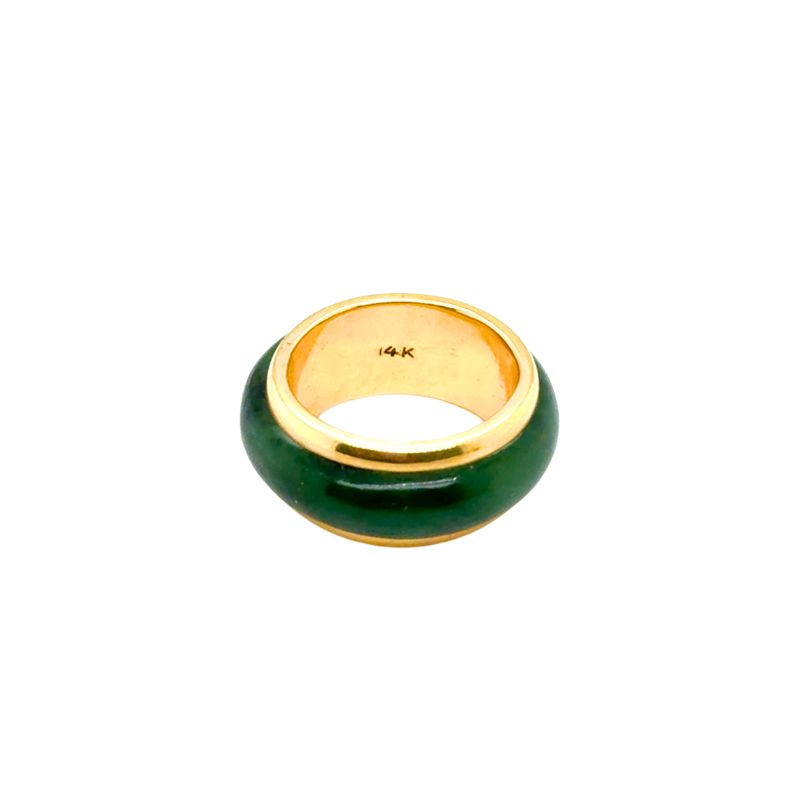 5mm Wide 3mm Thick Dome Jade Etnerity Sitting on 9mm Wide Band. Crafted in 14kt Yellow Gold. Vintage Circa 1930’s