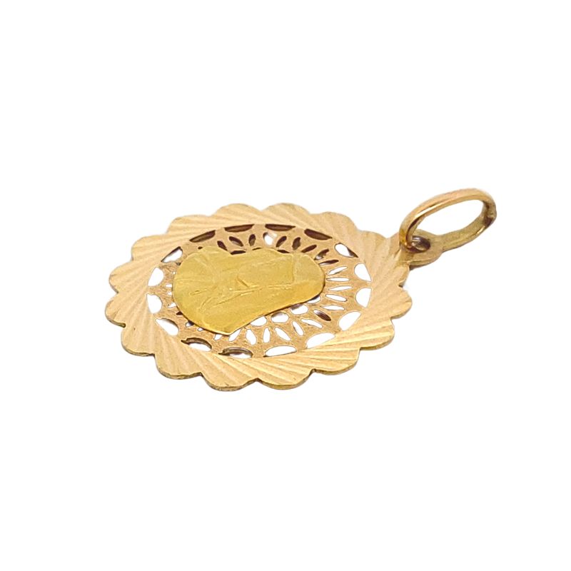 Virgin Mary Open Scallop Design Pendant, 21kt Yellow Gold. 25mm. Polish Finish with a Satin Mary in the center. Crafted in 21kt Yellow Gold