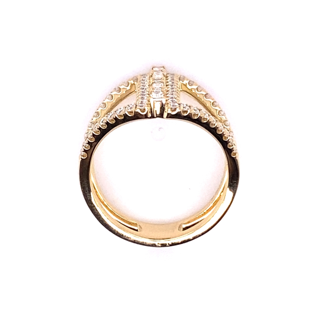 Wide Right Hand Ring with Baguette Diamond Accent, 14kt Yellow Gold. 4 Baguette Cut Diamonds, prong set. Carat – 0.15cts and 57 Round Diamonds, prong set. Carat – 0.59cts, Clarity – SI1, Color – FG, Width – 17mm tapering to 6mm. This ring is sizable.